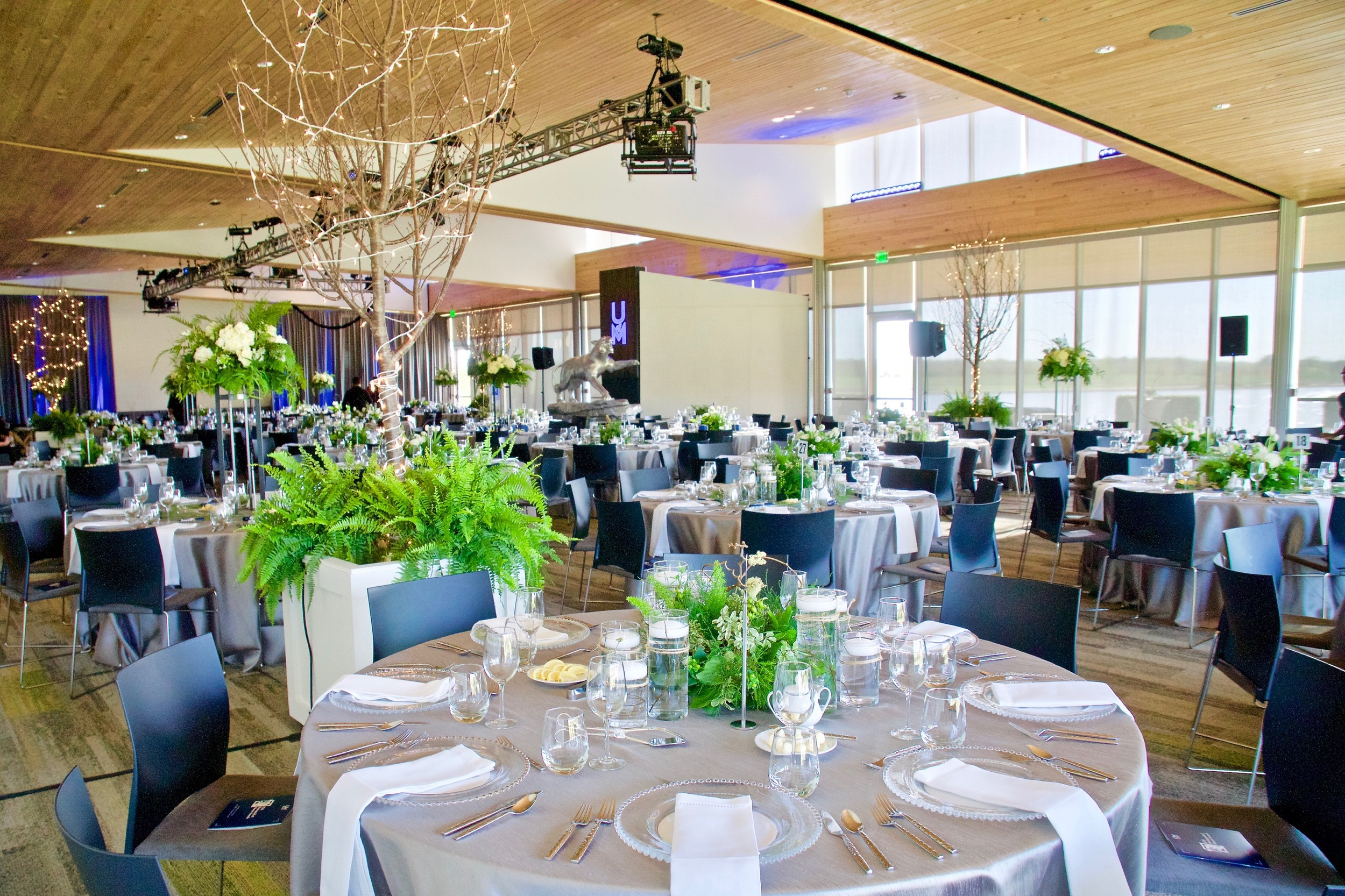 The main ballroom hosting the night's dining and ceremony continued to incorporate the color palette of Memphis blues and greys with splashes of fresh greenery all over as subtle but impactful nods to the growing nature of Shelby Farms Park surrounding the venue as well as the inspirational growth the honorary guests were being awarded for.