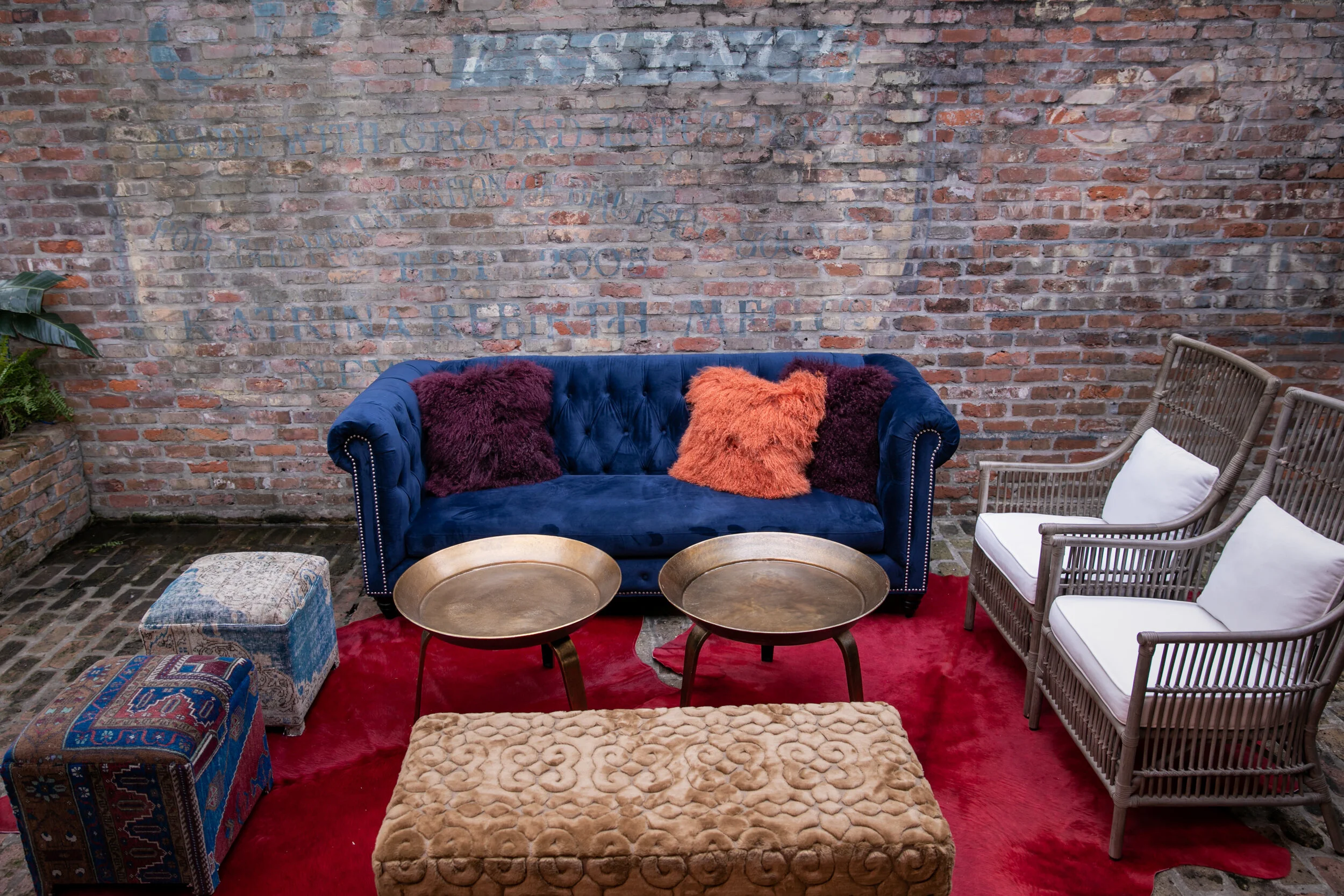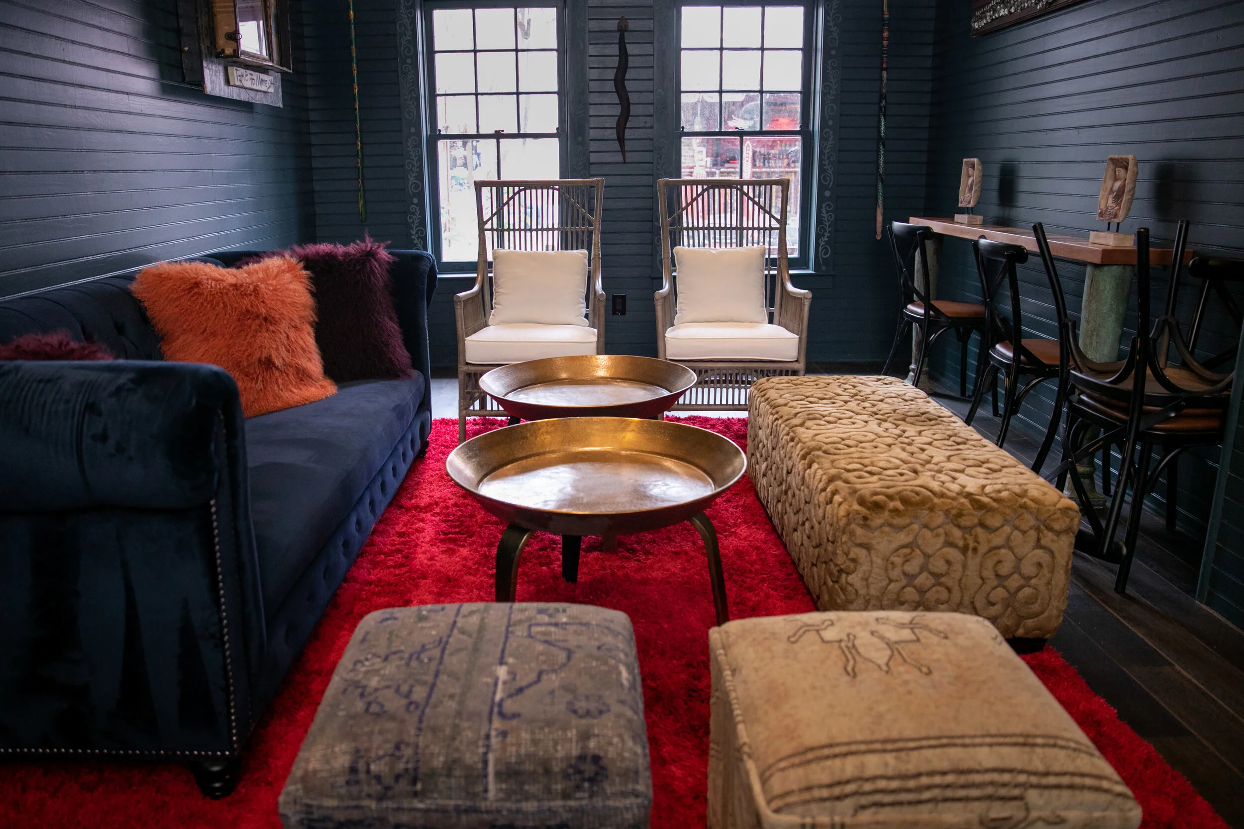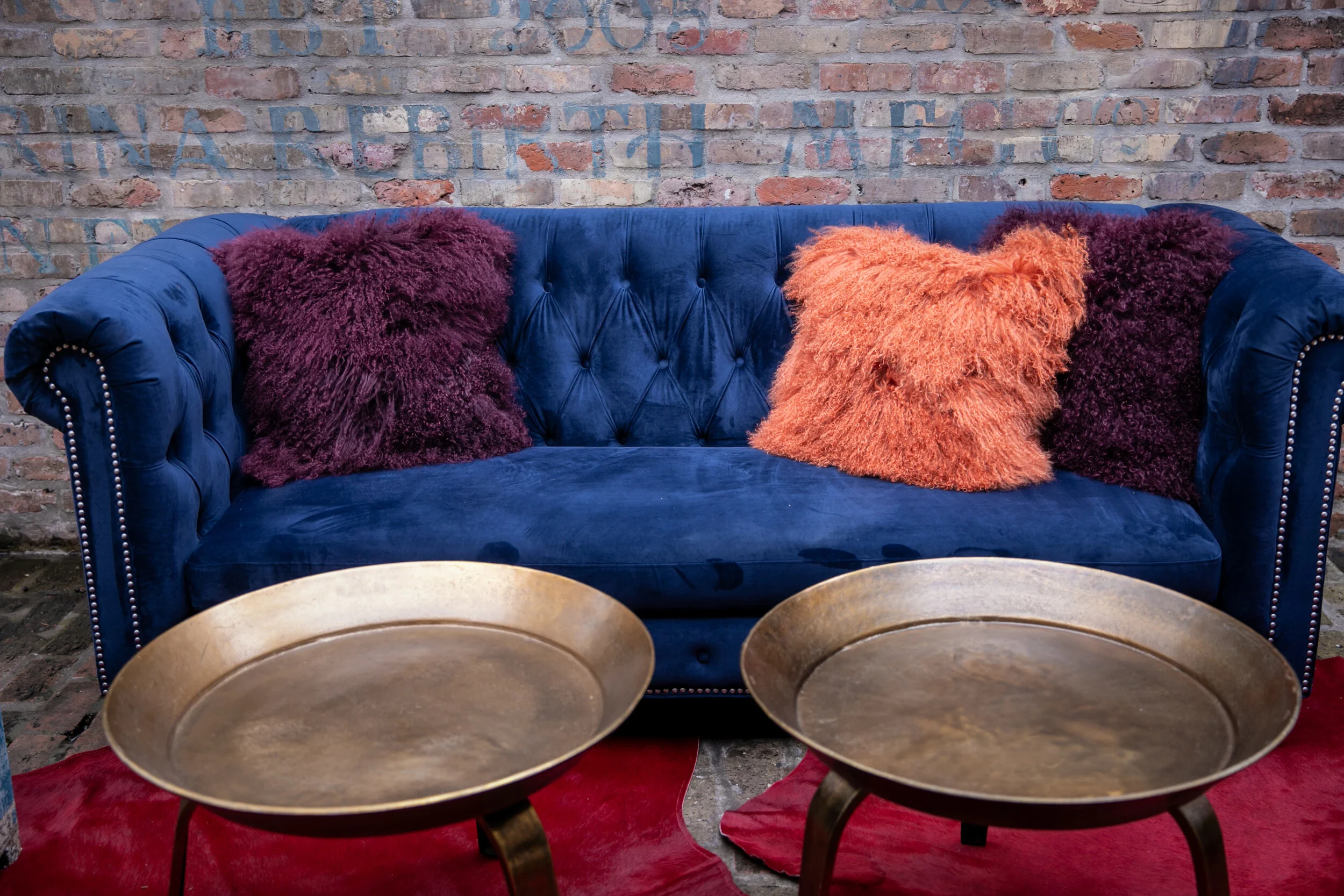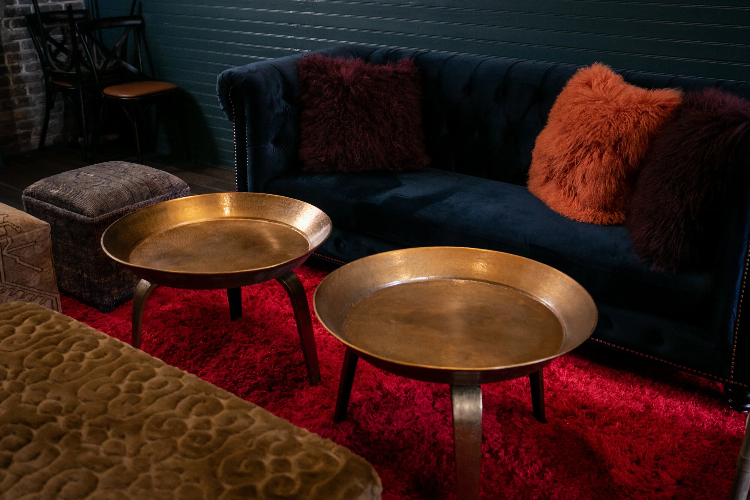 The red Cow Hide Rug serves as a saturated foundation, allowing our navy Velvet Sofa to anchor the lounge area. Its vibrant color is enhanced by the equally rich sculptured toffee Leopold Ottomans and one-of-a-kind Keva Cubes.
