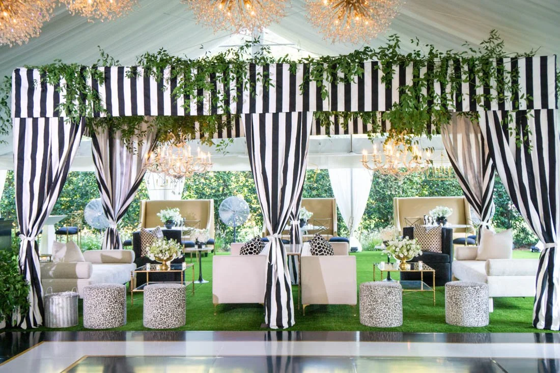 Not only should you create cohesive contrast in colors but also in patterns - just be sure that they aren’t fighting for attention. Here the stripe cabana draping makes the biggest statement, so smaller patterned accents like the Cheetah Jasper Ottomans, checkered Black Jack Pillows and dotted Buttons Pillows compliment the area.