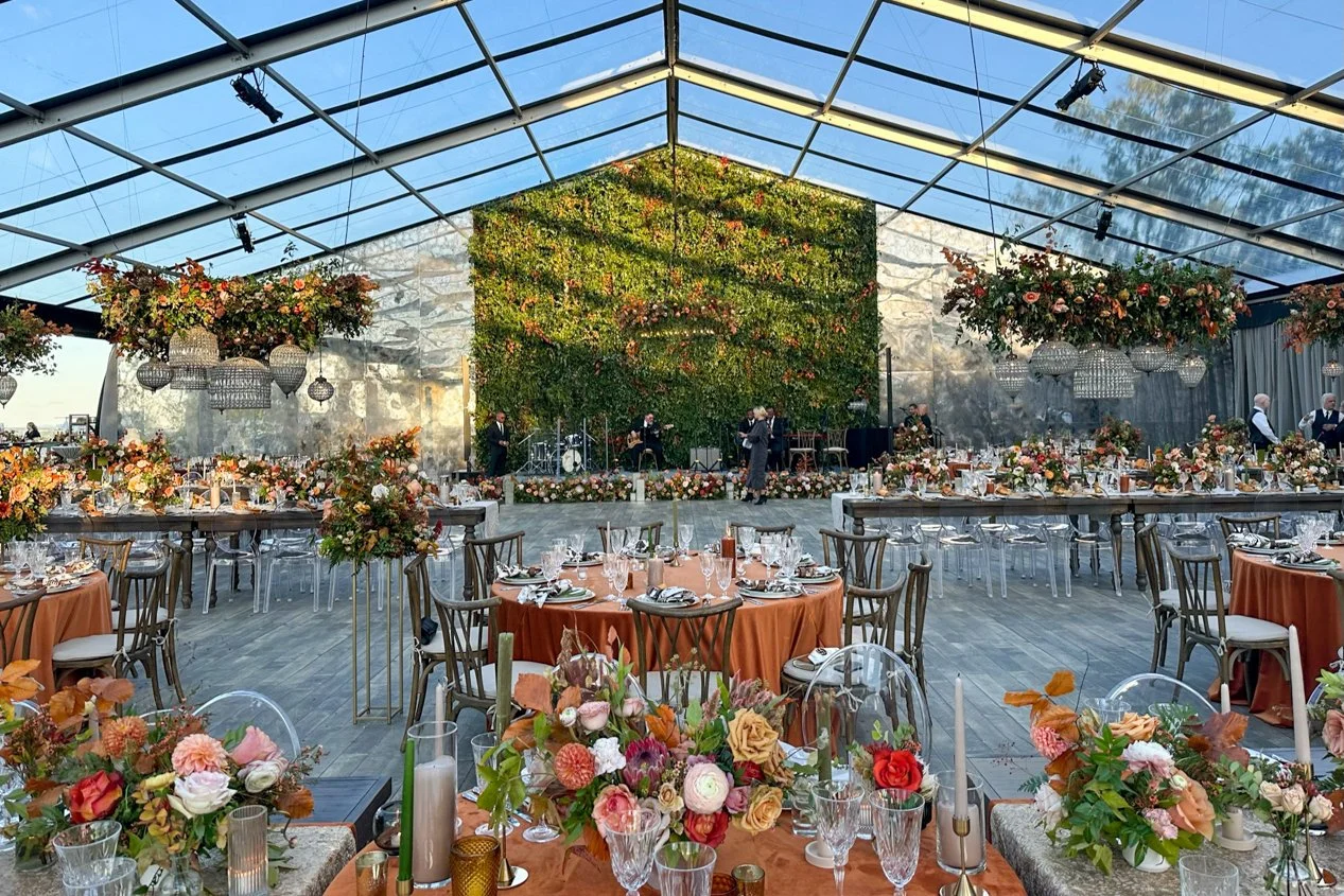 Breaths were taken away as guests arrived at this Autumn-colored wedding reception. The stunning Faux Antique Walls served as a divider in the tent between the dining and dancing spaces. Our team went a step further by engineering the wall panels with doors that open into a surprise reception room. We think if these walls could talk, they would say “Welcome, please enjoy.”