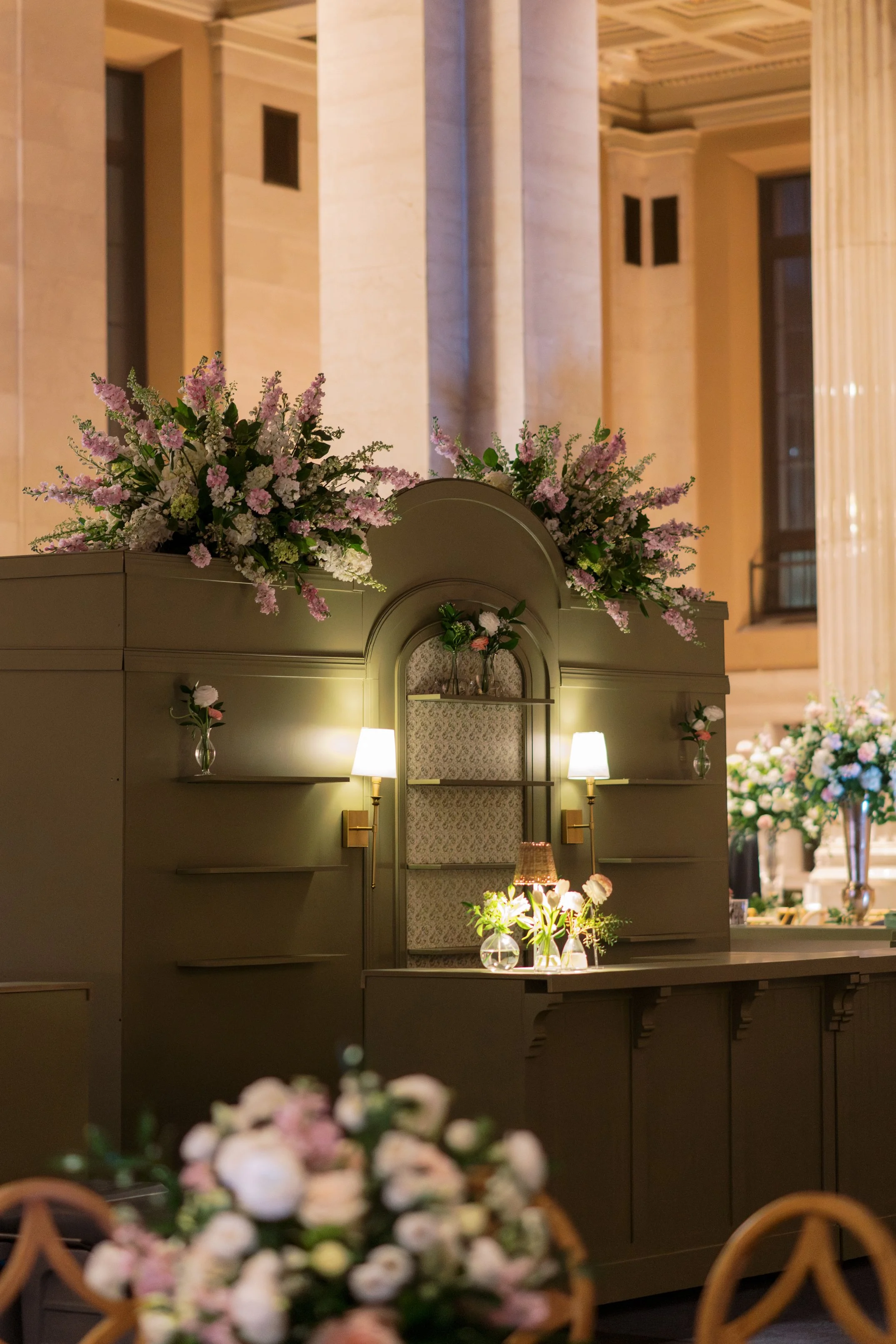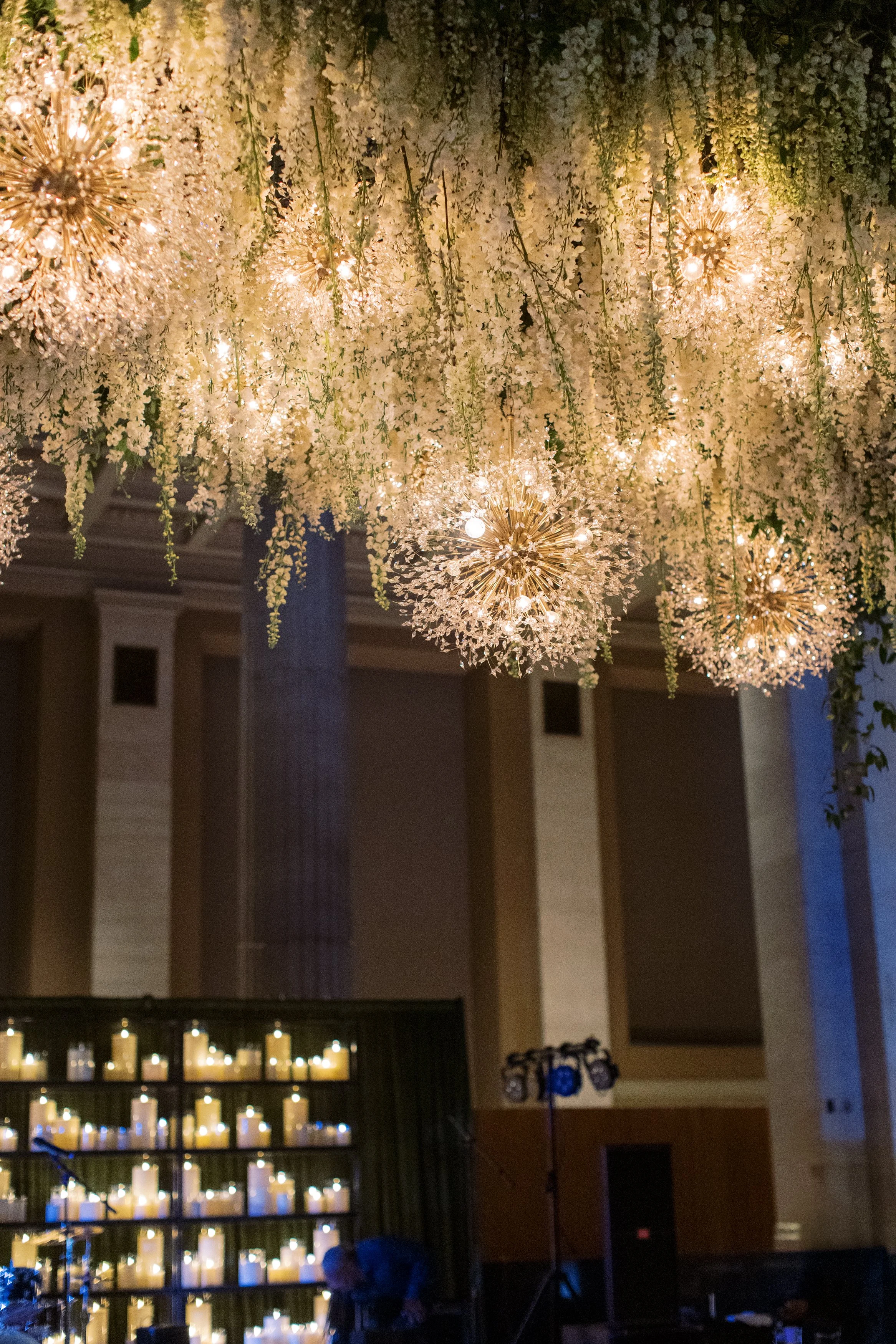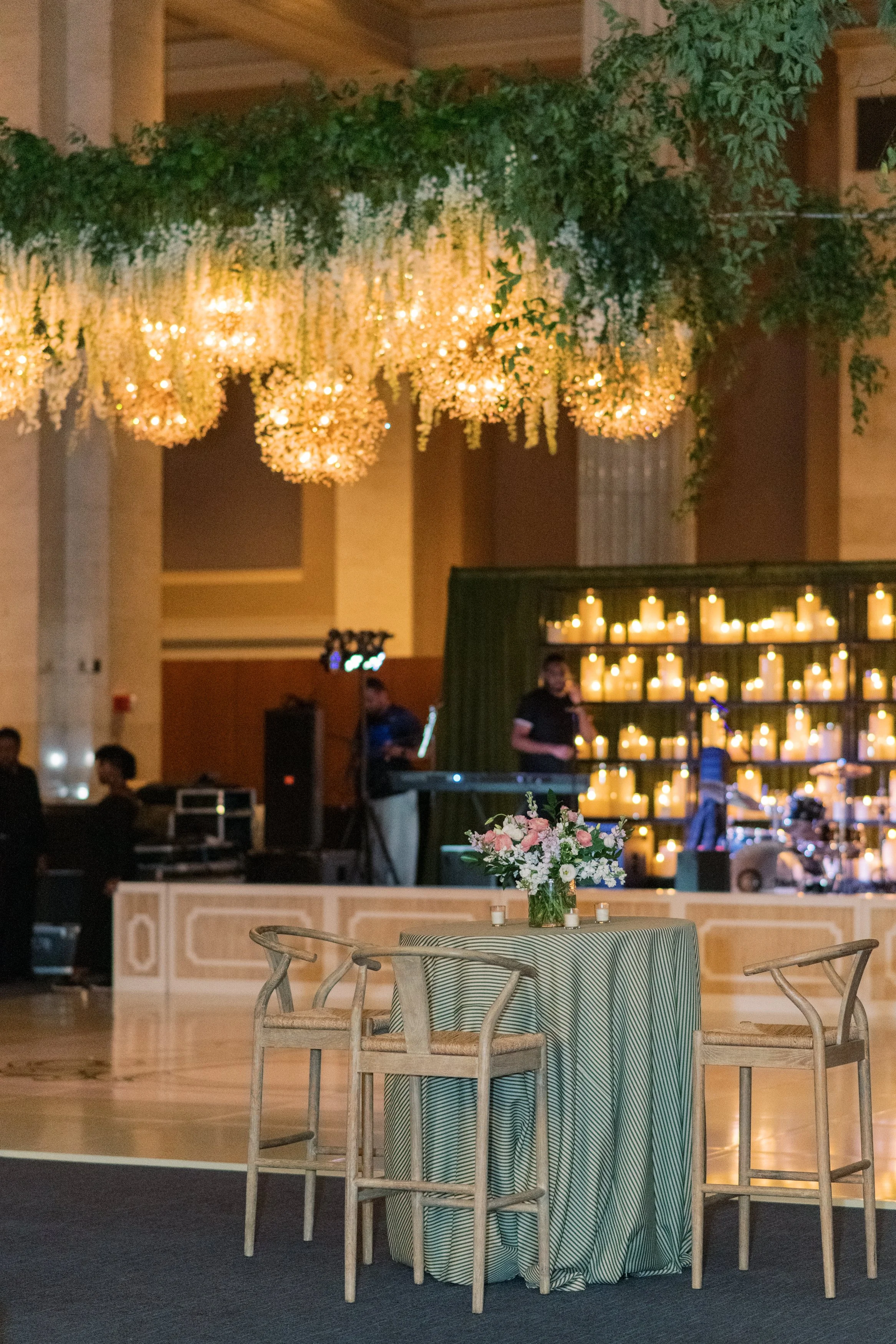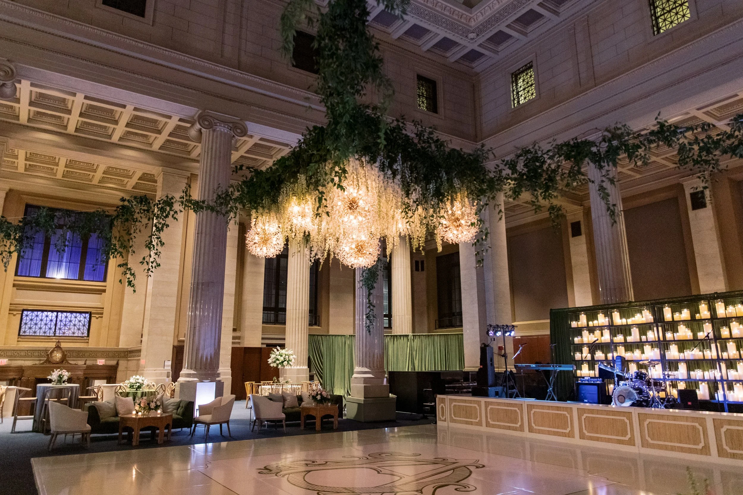 Behind the stage, we took an unexpected approach. Fully draped in our Avocado Velvet, we paired it with softly glowing candles placed along built-in shelving, creating depth and atmosphere. The result was immersive and elegant, transforming the stage into a moment guests couldn’t ignore. Overhead, our Arwen Pendant brought a soft glow to the dance floor, adding just the right amount of drama and warmth to anchor the room. John Mark Enterprises gave them their signature touch, adding cascading florals to fill out the pendants.