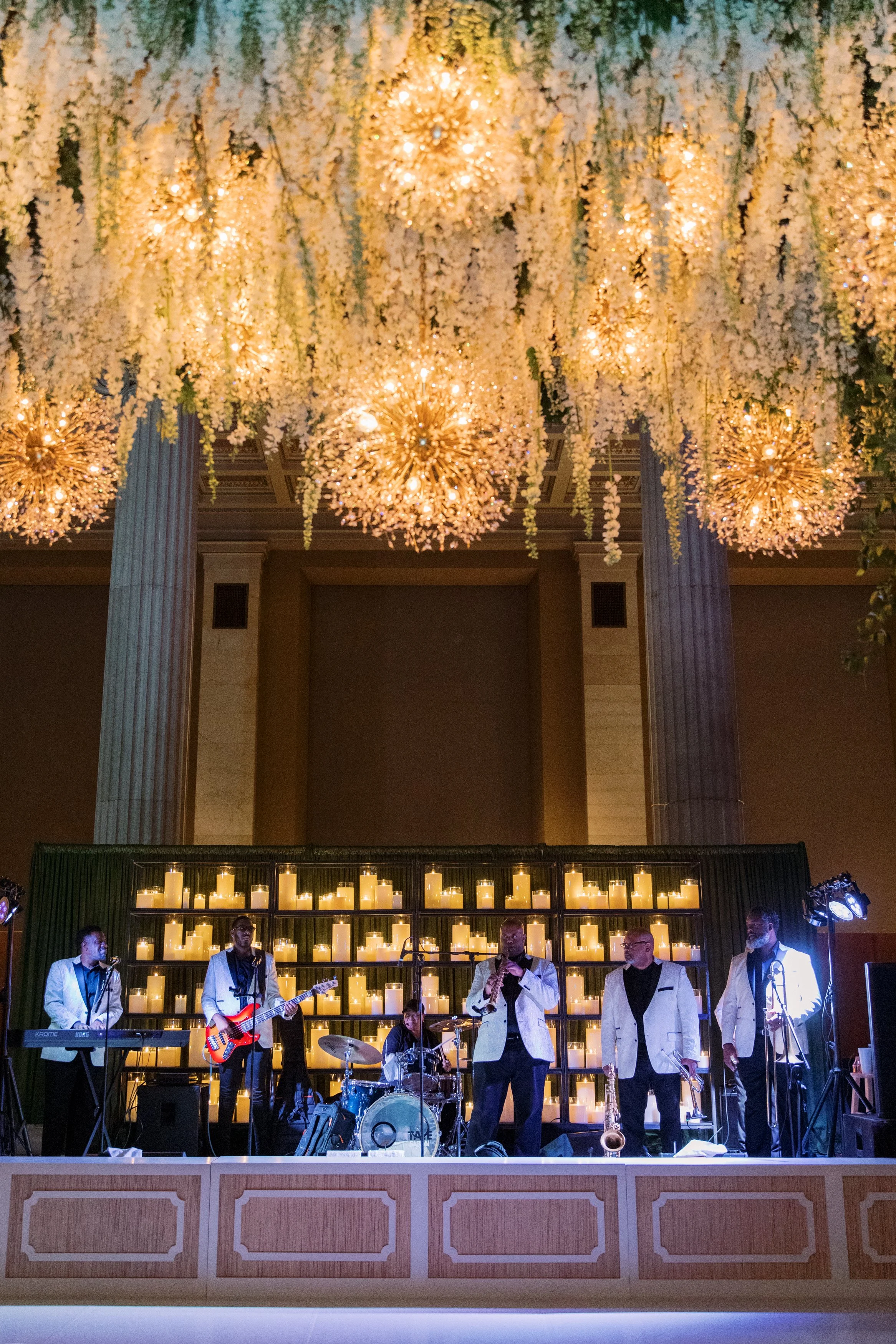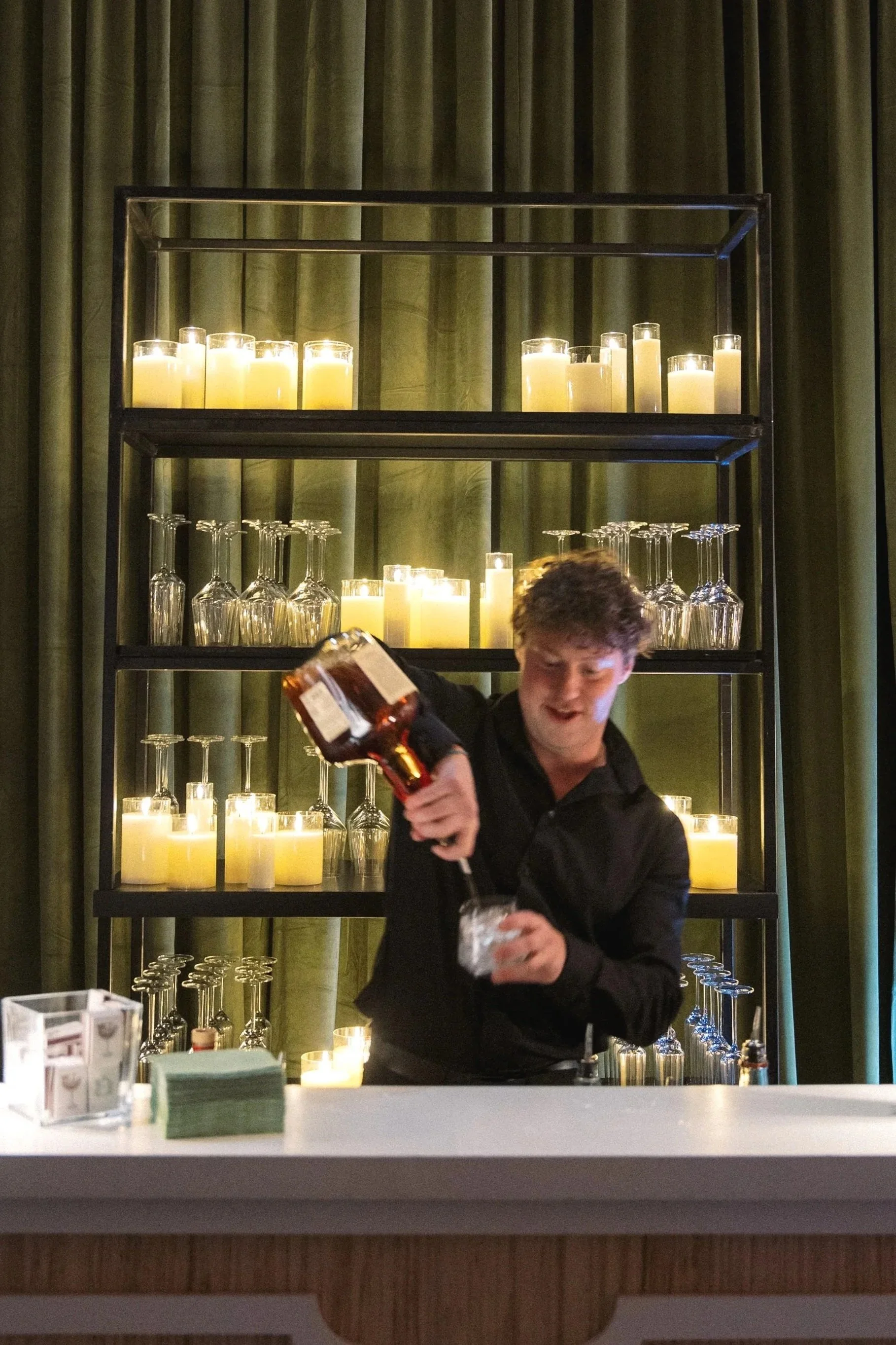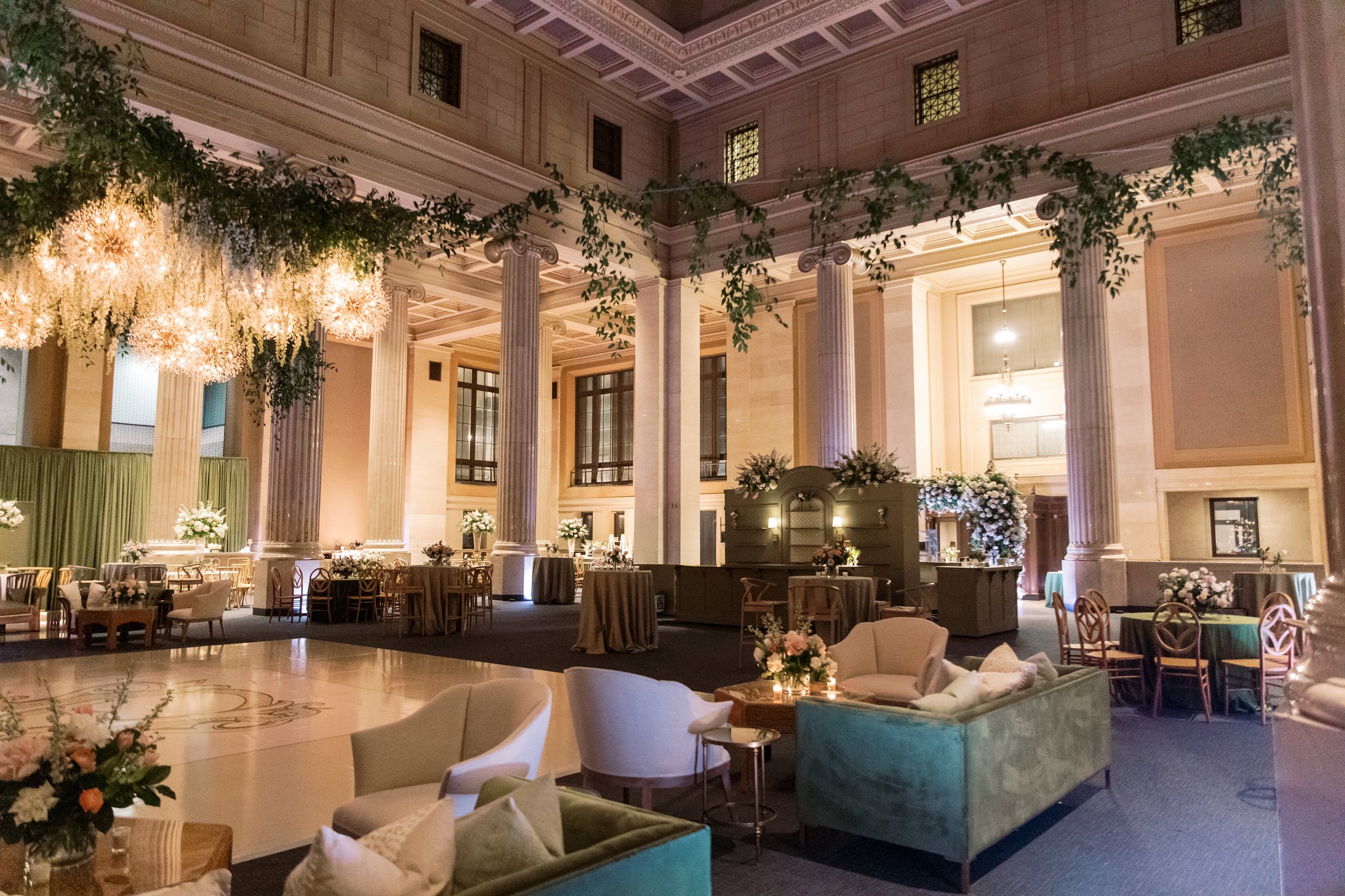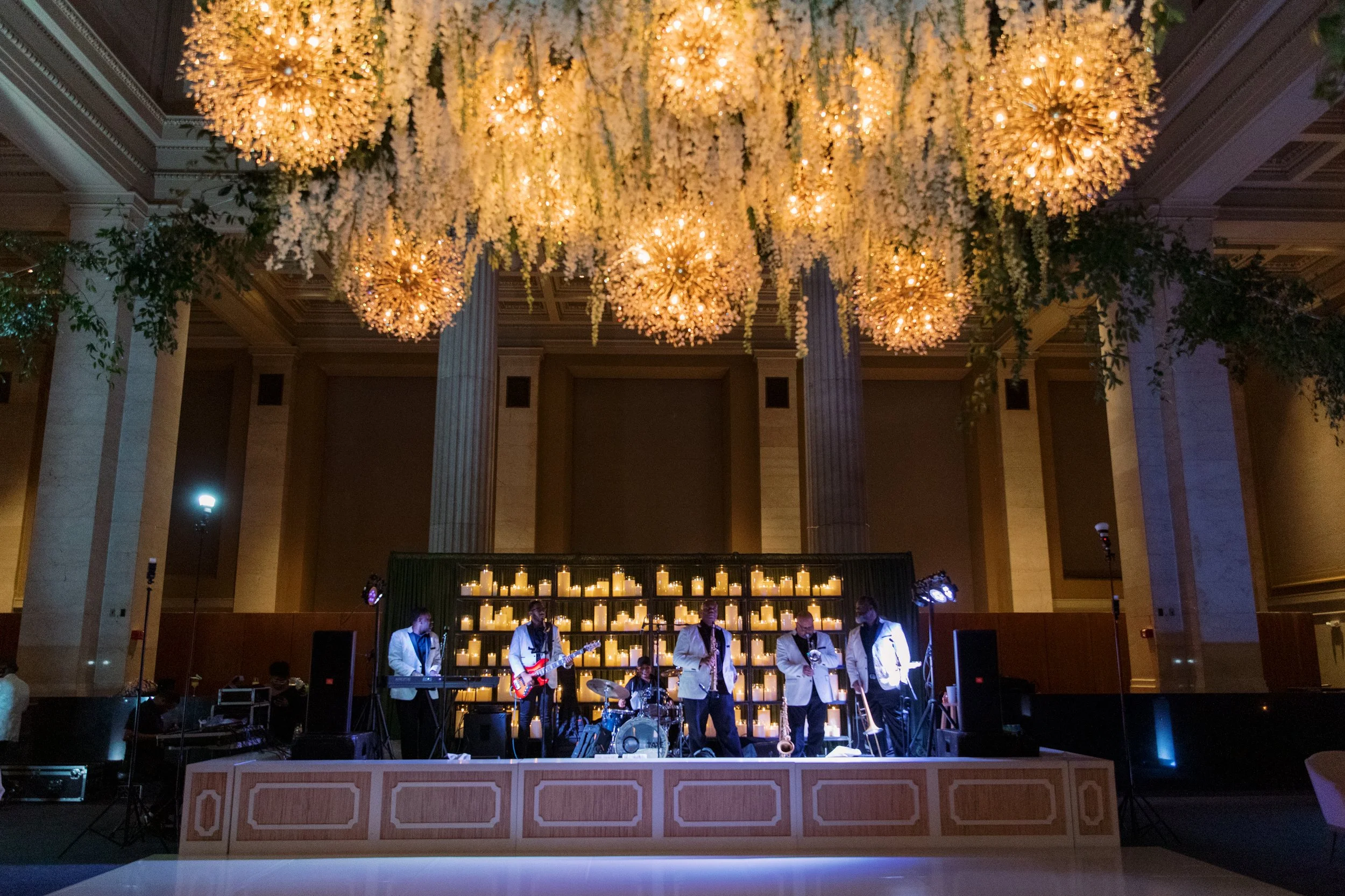 Behind the stage, we took an unexpected approach. Fully draped in our Avocado Velvet, we paired it with softly glowing candles placed along built-in shelving, creating depth and atmosphere. The result was immersive and elegant, transforming the stage into a moment guests couldn’t ignore. Overhead, our Arwen Pendant brought a soft glow to the dance floor, adding just the right amount of drama and warmth to anchor the room. John Mark Enterprises gave them their signature touch, adding cascading florals to fill out the pendants.