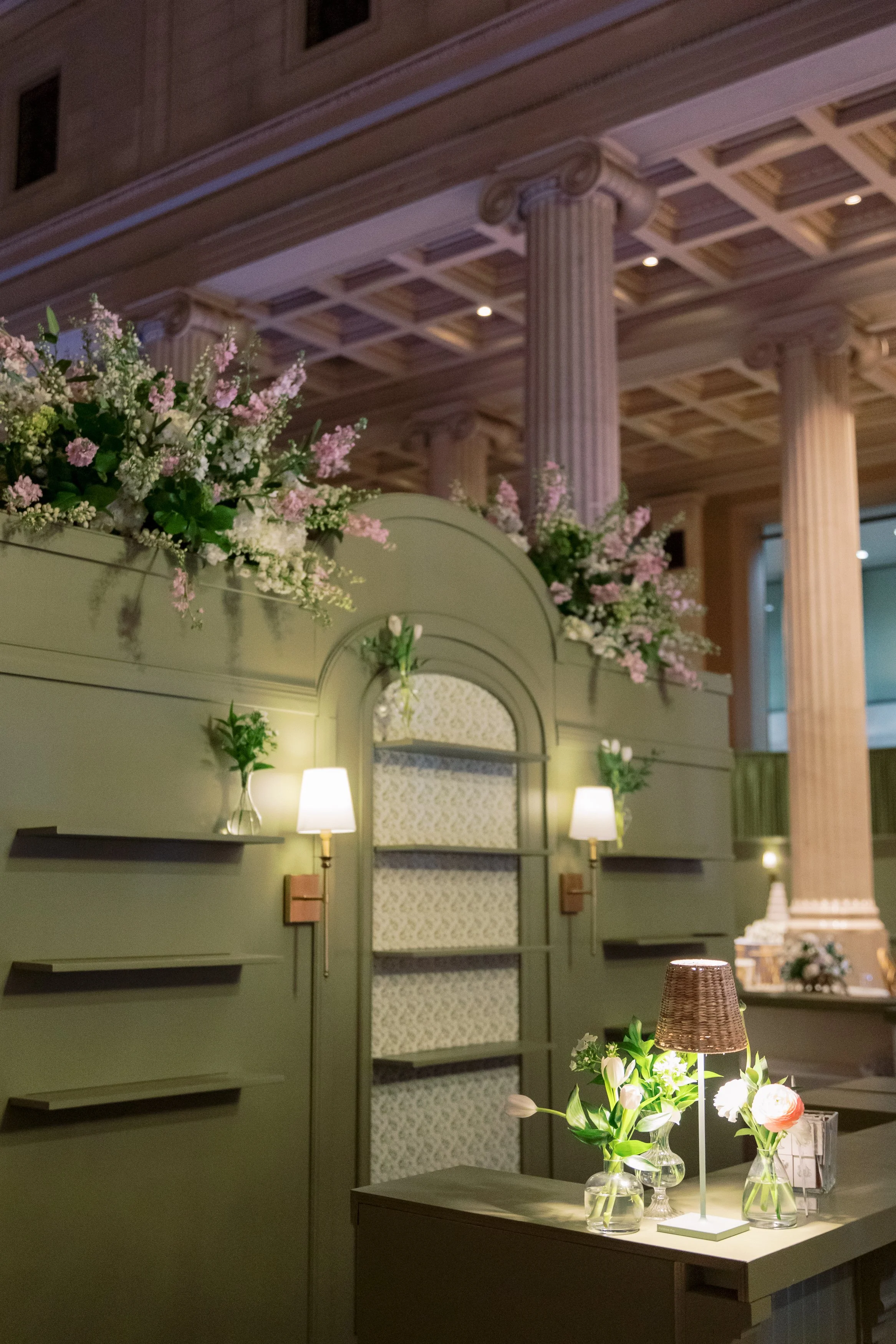 While the design carried a layered palette of green and warm tones, the true focal point was the stage. Our Farrah Grasscloth Stage Fronts introduced an organic texture, grounding the space in a way that felt both elevated and intentional.